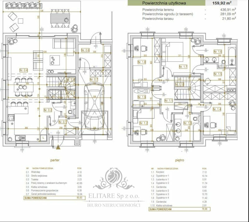Dwukondygnacyjny dom, zaprojektowany jest w ergonomiczny sposób z myślą o wygodzie domowników. Parter to głównie strefa dzienna o powierzchni 80,93m2 i nocna na piętrze o powierzchni 78,99m2 co daje nam dom o powierzchni 159,9m2 na dużej i pięknej działce o powierzchni aż 436,91m2.